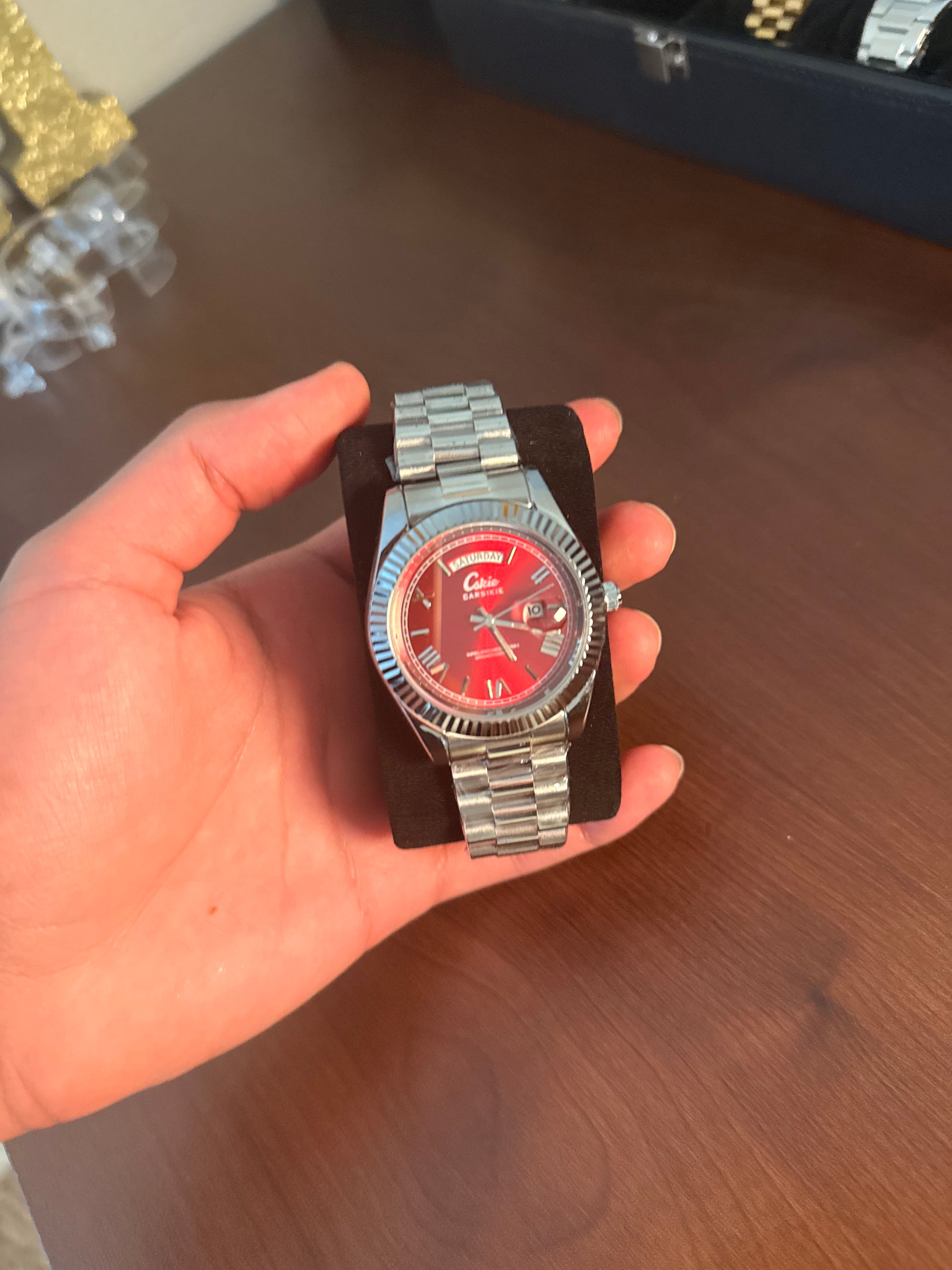 The Imperium Rubra is more than a watch — it is a statement of ambition and power. The striking crimson dial symbolizes passion and drive, reminding you with every glance of your relentless pursuit of success. Crafted in polished stainless steel with a sleek, refined profile, it empowers your presence in any setting — from the boardroom to evening occasions. With quartz precision and water resistance, it delivers reliability wrapped in timeless elegance. Wearing the Imperium Rubra means carrying confidence, strength, and prestige on your wrist.